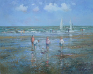110cm x 80cm (Large) Beach scene | Foreground 3 people and model boat | Background 3 sailing boats | 1 beach belle.